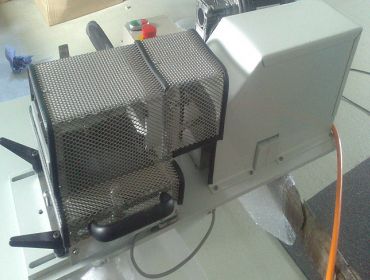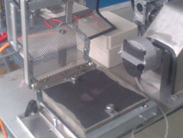 Das Abriebtestgerät ermöglicht das Feststellen der Abriebfestigkeit verschiedenster Materialien. In diesem speziellen Fall wird die Abriebfestigkeit von Kraftfahrzeug-Innenböden gemessen, indem der Abrieb durch einen Schuhabsatz simuliert wird.