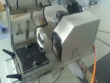 Das Abriebtestgerät ermöglicht das Feststellen der Abriebfestigkeit verschiedenster Materialien. In diesem speziellen Fall wird die Abriebfestigkeit von Kraftfahrzeug-Innenböden gemessen, indem der Abrieb durch einen Schuhabsatz simuliert wird.